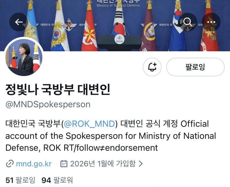 국방부는 대변인 명의의 공식 사회관계망서비스(SNS) 엑스(X·옛 트위터) 채널(@MNDSpokesperson)을 신규 개설했다고 15일 밝혔다.