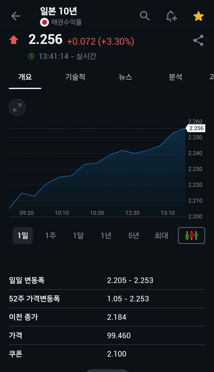 19일 인베스팅닷컴에 따르면 오후 1시30분 현재 일본 국채 10년물 수익률은 전일 대비 0.069%포인트 상승한 2.253%까지 치솟았다. 이는 1999년 2월 이후 약 27년 만에 가장 높은 수준이다.