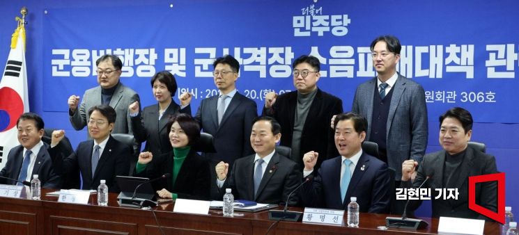 한정애 더불어민주당 정책위의장과 국방위 소속 의원들이 20일 국회 의원회관에서 열린 군용비행장 및 군 사격장 소음피해대책 관련 당정 협의에서 이두희 국방부 차관 등 관계자들과 함께 기념 촬영을 하고 있다.