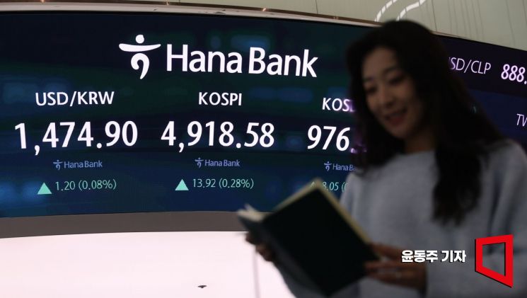 20일 코스피 지수가 4900선에서 등락을 거듭하고 있다. 서울 중구 하나은행 딜링룸 현황판에 코스피 지수와 코스닥 지수, 환율이 표시되고 있다.