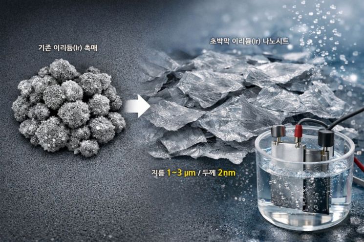 이에 착안해 연구팀은 알갱이처럼 뭉쳐 있는 촉매를 종이처럼 얇고 넓게 펼치는 형태의 혁신을 고안했다. 수전해 촉매로 지름 1~3㎛, 두께 2㎚ 이하의 초박막 이리듐 나노시트를 개발해 같은 양의 이리듐으로도 반응에 참여하는 면적을 크게 늘린 것이 핵심이다. 이는 소량의 금속으로도 보다 많은 수소를 만들 수 있게 하는 단초가 됐다.