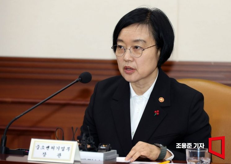 한성숙 중소벤처기업부 장관이 21일 서울 종로구 정부서울청사에서 열린 경제관계장관회의에 참석해 대중소기업 상생 성장 전략에 대해 발언하고 있다.