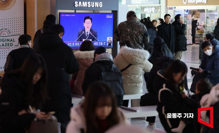 21일 서울 용산구 서울역 대합실에서 시민들이 이재명 대통령 신년 기자회견 방송을 지켜보고 있다.