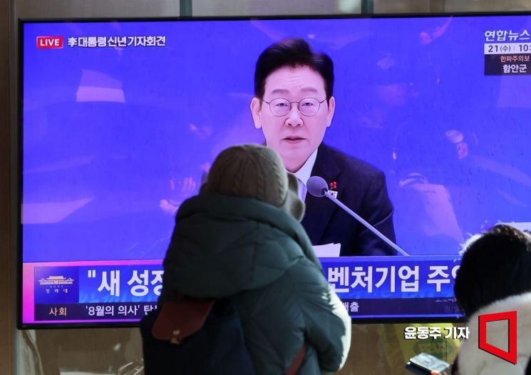 21일 서울 용산구 서울역 대합실에서 시민들이 이재명 대통령 신년 기자회견 방송을 지켜보고 있다.