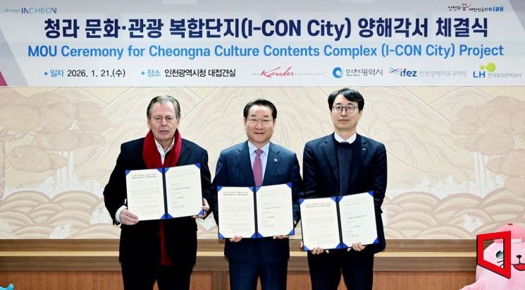 인천경제자유구역청은 21일 인천시청에서 미국 유명 호텔 체인 케슬러 컬렉션, 한국토지주택공사(LH)와 청라 아이콘 시티 프로젝트 추진을 위한 양해각서를 체결했다.