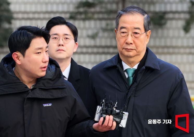 내란 우두머리 방조 혐의를 받는 한덕수 전 국무총리가 21일 서울중앙지법에서 열린 1심 선고 공판에 출석하고 있다.