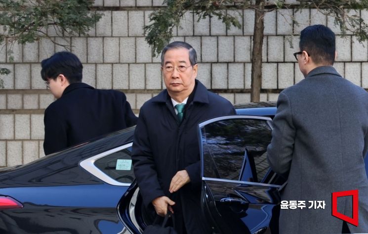 내란 우두머리 방조 혐의를 받는 한덕수 전 국무총리가 21일 서울중앙지법에서 열린 1심 선고 공판에 출석하고 있다.