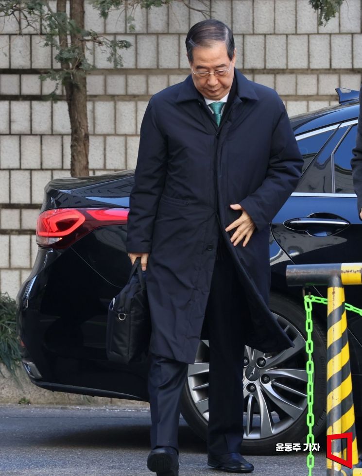 내란 우두머리 방조 혐의를 받는 한덕수 전 국무총리가 21일 서울중앙지법에서 열린 1심 선고 공판에 출석하고 있다.