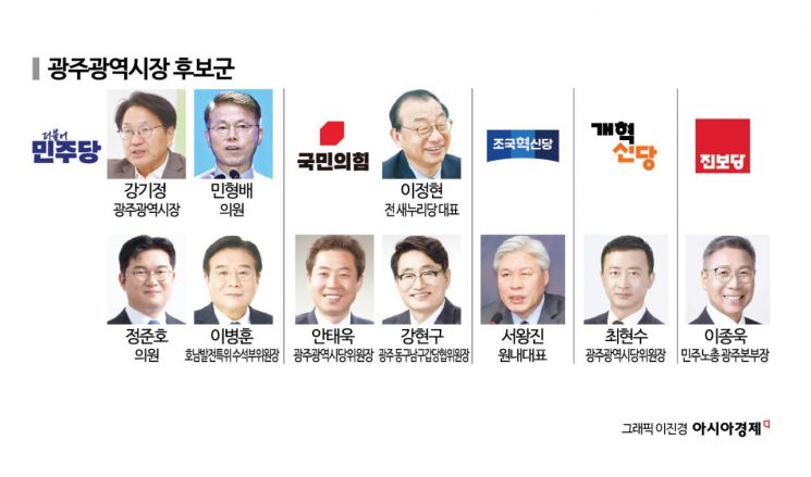 ◇누가 후보자로 거론되나= 민주당은 강 시장, 민형배 의원(광주 광산구을), 정준호 의원(광주 북구갑), 이병훈 호남특위 수석부위원장 등이 후보군이다. 국민의힘은 이정현 전 의원, 안태욱 광주시당위원장, 강현구 동남갑당협위원장 등이 물망에 오른다. 이 밖에 최현수 개혁신당 광주시당위원장, 이종욱 진보당 민주노총 광주본부장, 서왕진 조국혁신당 원내대표 등도 출마 후보군이다.