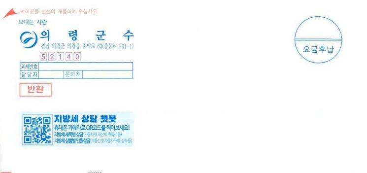 경남 의령군은 지방세 고지서 전면에 '지방세 챗봇 상담서비스' QR코드를 삽입해 발송한다고 21일 밝혔다.