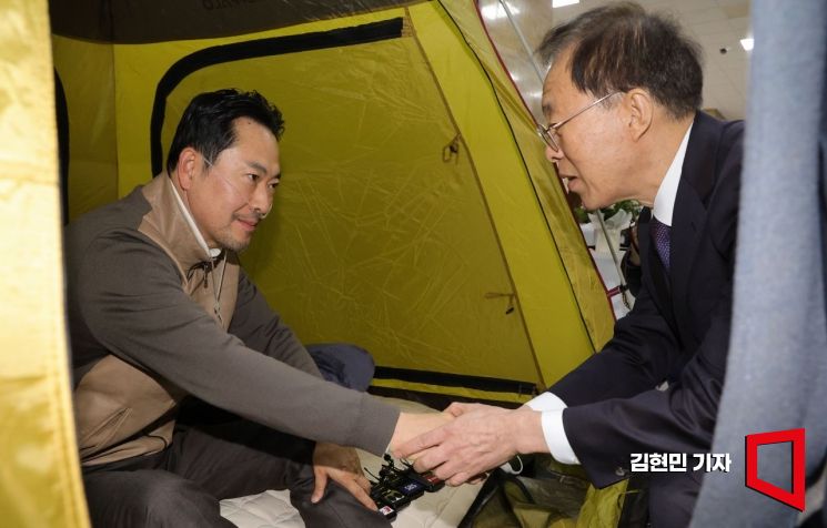 통일교·공천헌금 '쌍특검' 수용을 요구하며 단식 중인 국민의힘 장동혁 대표가 21일 국회 로텐더홀 단식 농성장을 찾은 이석연 국민통합위원장과 인사하고 있다.