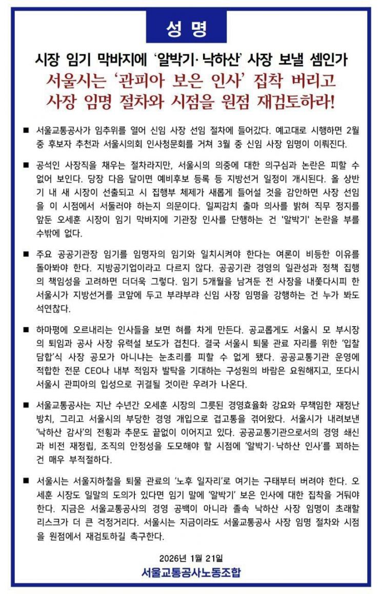 민주노총 산하 서울교통공사노동조합(1노조)은 이날 성명에서 "올해 상반기 새 서울시장이 선출되고 시 집행부 체제가 새롭게 들어설 것을 고려하면 사장 선임을 이 시점에 서둘러야 하는지 의문"이라며 "일찌감치 출마 의사를 밝혀 직무 정지를 앞둔 오 시장이 임기 막바지 기관장 인사를 단행하는 건 알박기 논란을 부를 수밖에 없다"고 비판했다.