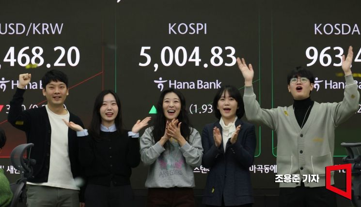 코스피가 꿈의 지수 '5000'을 돌파한 22일 서울 중구 하나은행 딜링룸에서 직원들이 기뻐하며 박수를 치고 있다.