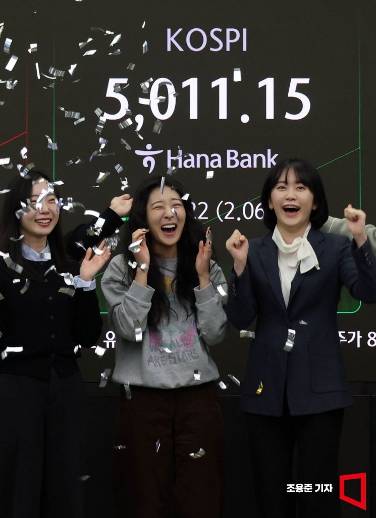 코스피가 꿈의 지수 '5000'을 돌파한 22일 서울 중구 하나은행 딜링룸에서 직원들이 기뻐하고 있다.