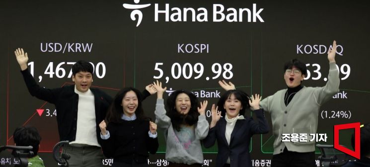 코스피가 꿈의 지수 '5000'을 돌파한 22일 서울 중구 하나은행 딜링룸에서 직원들이 기뻐하고 있다.