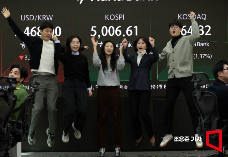 코스피가 꿈의 지수 '5000'을 돌파한 22일 서울 중구 하나은행 딜링룸에서 직원들이 기뻐하며 박수를 치고 있다.