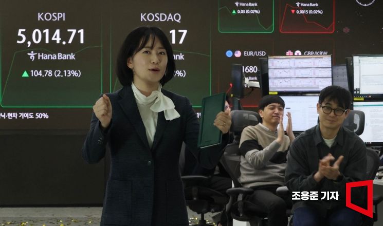 코스피가 꿈의 지수 '5000'을 돌파한 22일 서울 중구 하나은행 본점 딜링룸에서 직원들이 기뻐하며 박수를 치고 있다. 이날 코스피는 전장보다 77.13포인트(1.57%) 오른 4987.06으로 출발해 곧바로 5000선을 넘어섰다. 이는 지난해 10월27일 4000포인트를 넘어선지 채 3달이 되지 않아 이룬 성과다.