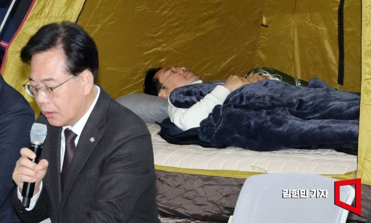 통일교·공천헌금 '쌍특검' 입법을 요구하며 단식 투쟁에 나선 지 여드레를 맞은 장동혁 국민의힘 대표가 22일 국회 로텐더홀 텐트 안에 누워있는 동안 최고위원회의가 열리고 있다.
