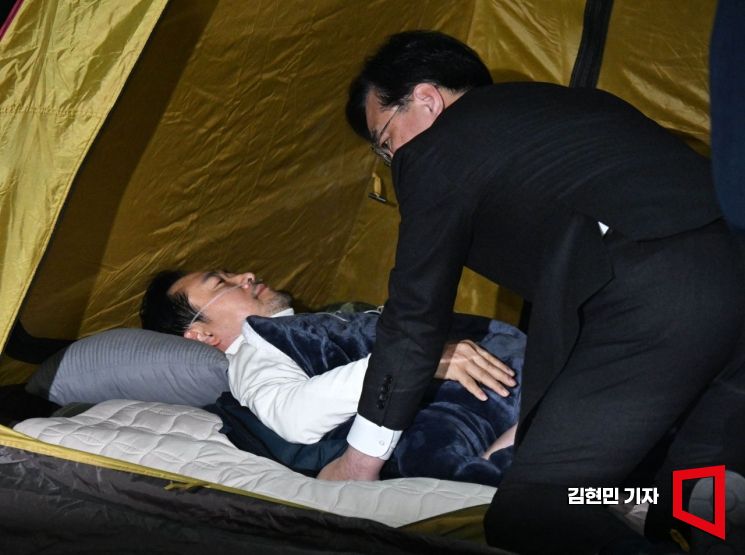송언석 국민의힘 원내대표가 22일 국회 로텐더홀에서 통일교·공천헌금 '쌍특검' 수용을 요구하며 여드레째 단식 중인 장동혁 대표를 살펴보고 있다.