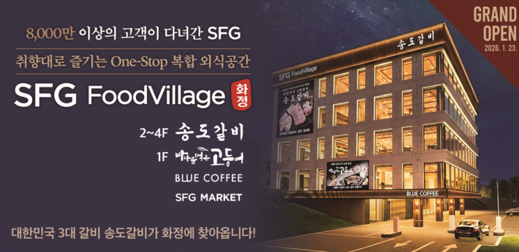 SFG 관계자는 "옥빛공원 조망권을 갖춘 'SFG 푸드빌리지 화정'은 가족 외식, 기업 회식 등 어떤 모임에도 최적화된 맞춤형 미식 공간"이라며 "역동적인 붉은 말의 해를 맞아 고객에게 도약의 활력을 전하는 고품격 맛과 서비스로 지역 최고의 명소로 자리매김하겠다"고 말했다.