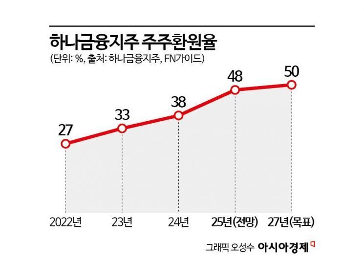 이 속도대로라면 하나금융의 주주환원율 목표도 조기 달성이 유력하다. 하나금융은 '기업가치 제고 계획'을 통해 2027년까지 주주환원율 50%를 달성하겠다고 발표한 바 있다. 실제 하나금융의 주주환원율은 2022년 27%에서 2023년 33%, 2024년 38%로 꾸준히 상승했다. 하나금융의 속도감 있는 주주환원으로 2025년 주주환원율은 전년 대비 대폭 상승한 48%대에 이를 것으로 전망된다. 이 추세대로라면 당초 발표한 2027년 주주환원율 50%도 이르면 연내 가능할 것으로 보인다.