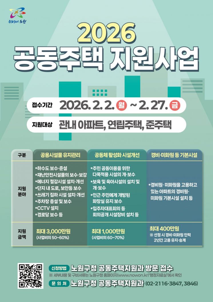 서울 노원구(구청장 오승록)가 쾌적하고 안전한 주거환경 조성과 주민 공동체 활성화를 위해 '2026년 공동주택 지원사업'을 추진한다.