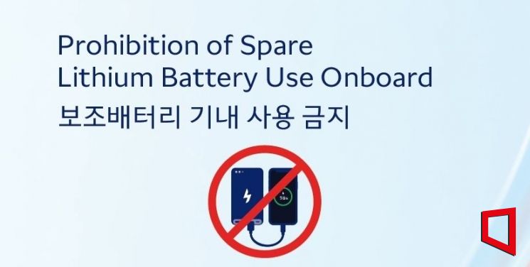 대한항공과 아시아나항공 , 진에어 , 에어부산, 에어서울의 국내선 및 국제선 항공편 기내에서 보조배터리로 휴대전화, 태블릿, 노트북, 카메라 등 전자기기를 충전하는 행위가 모두 금지된다.