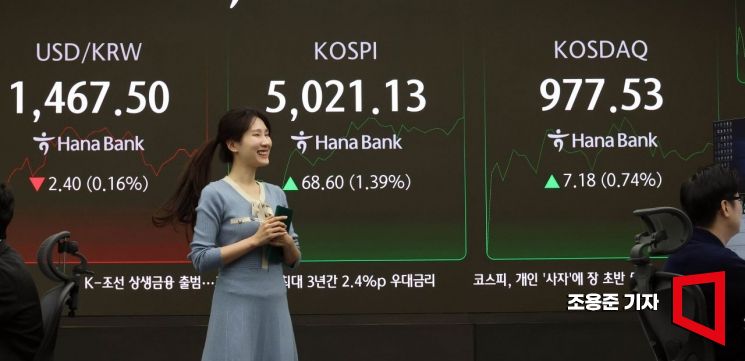코스피가 장중 5021.13으로 사상 최고가를 경신한 가운데 23일 서울 중구 하나은행 본점 딜링룸에서 직원이 증시와 환율 등을 모니터하고 있다. 이날 코스피는 전 거래일(4952.53)보다 31.55포인트(0.64%) 상승한 4984.08에 장을 시작했다.