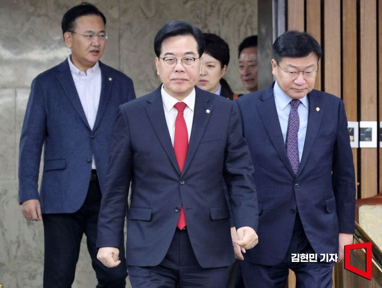 송언석 국민의힘 원내대표가 23일 국회에서 열린 원내대책회의에 참석하고 있다.