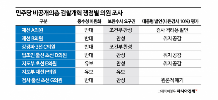 의총 직후 의원들 사이에선 이재명 대통령의 신년기자회견에서의 검찰개혁과 관련한 발언에 대한 의견들도 많았다. 법조인 출신 초선 D의원은 "실무를 모르는 분들은 '검찰망국론'을 계속 펴지만, 율사 출신들은 대통령 발언 이후 온건파로 많이 돌아선 분위기"라고 했다. 재선 B의원은 "대통령의 발언이 가이드라인이라 보긴 어렵고, 그 우려사항을 어떻게 해소할 수 있을까 고민하는 지점이라고 여겨주면 된다"고 했다. 다만 대통령의 '검찰 2000명 중에 나쁜 사람은 10% 아니냐'는 발언 직후 당내에서 검찰 개혁 온건파에 속하던 의원들이 의총에서 선명하게 존재감을 드러냈다는 기류다. 초선 E의원은 검찰에 보완수사권을 두는 것을 찬성한다며 "대통령 말씀에 일리가 있다고 생각한다"고 했다.