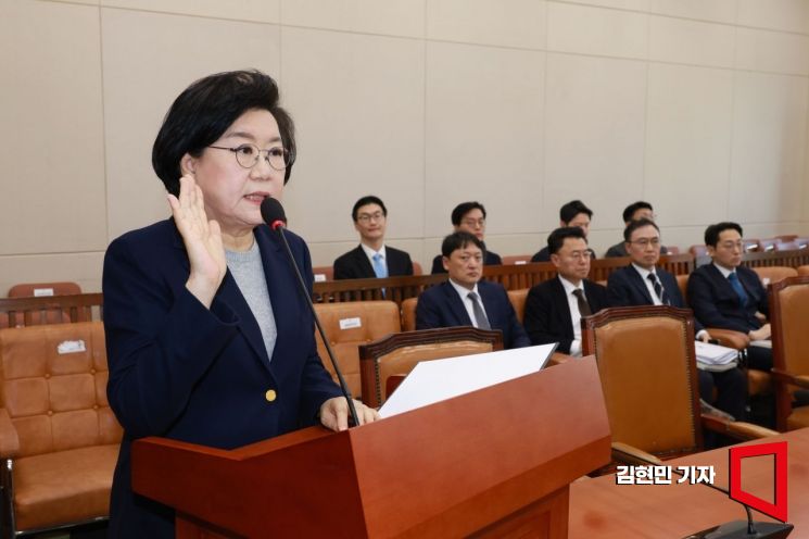 이혜훈 기획예산처 장관 후보자가 23일 서울 여의도 국회에서 열린 재정경제기획위원회의 인사청문회에서 선서를 하고 있다.