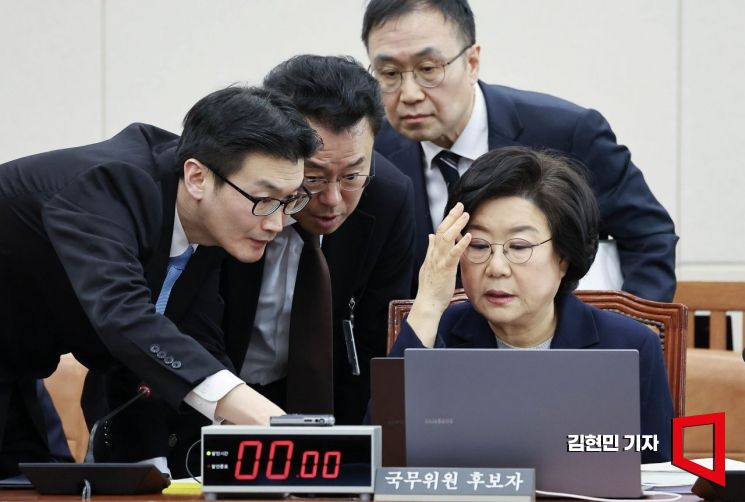 이혜훈 기획예산처 장관 후보자가 23일 국회에서 열린 재정경제기획위원회의 인사청문회에 출석해 실무자들과 대화하고 있다.