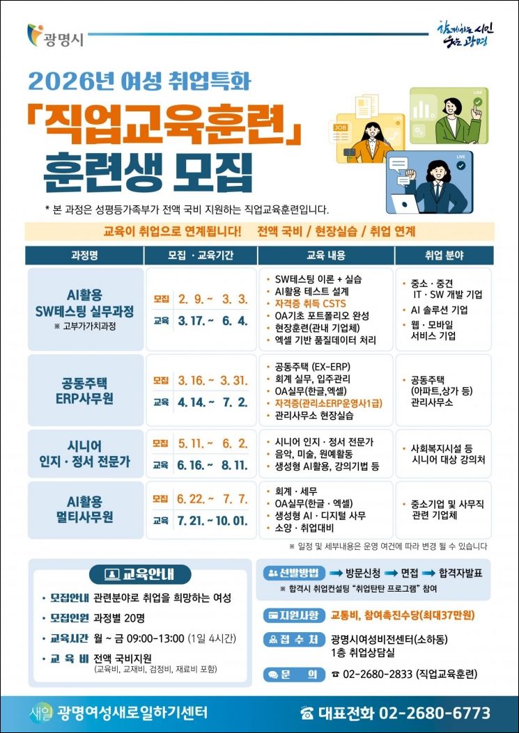 경기도 광명시는 경력단절 여성과 재취업 희망 여성의 경제활동 복귀를 돕기 위한 '2026년 맞춤형 직업교육훈련' 과정 참여자를 다음 달 9일부터 순차 모집한다고 23일 밝혔다.