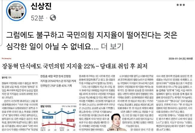 신 시장은 24일 자신의 SNS를 통해 "지금 국민의힘 지지율 정체는 단순한 현상이 아닌 심각한 수준의 위기"라고 진단하며 당 지도부가 보수의 명운을 걸고 '혁명적 수준의 자세 전환'에 나설 것을 촉구했다.