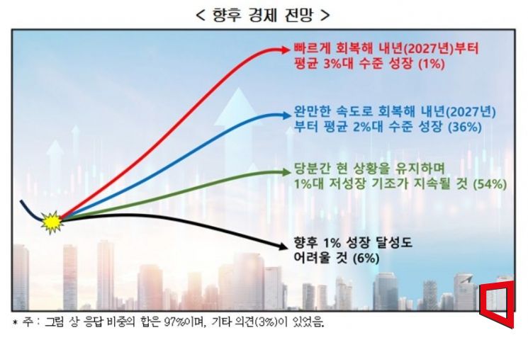 '완만한 속도로 회복해 내년부터 평균 2%대 수준 성장'할 것이란 응답은 36%에 그쳤다. '향후 1% 성장 달성도 어려울 것'이란 응답은 6%였다. 반면 경제가 '빠르게 회복해 내년부터 평균 3%대 수준 성장'할 것이란 응답은 1%에 불과했다.