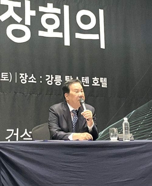 우오현 SM그룹 회장이 23일 강원 강릉 호텔탑스텐에서 열린 건설 계열사 대표이사 및 현장소장 간담회에서 발언하고 있다. 호텔탑스텐은 SM그룹 제조·서비스부문이 운영하는 호텔이다. SM그룹
