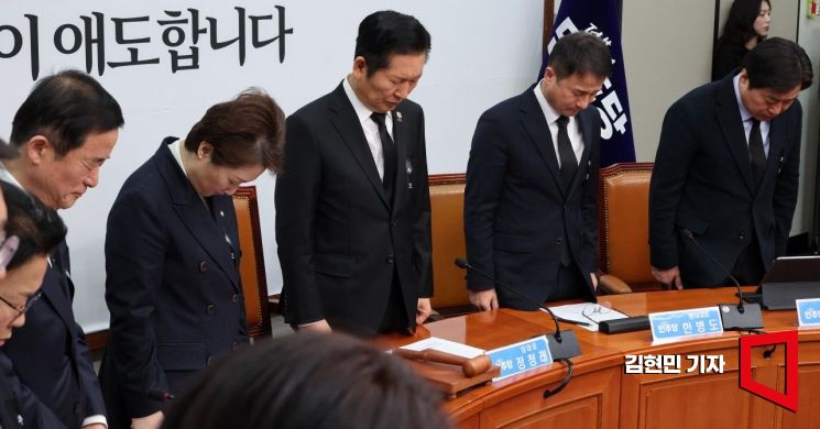 정청래 대표와 한병도 원내대표를 비롯한 더불어민주당 지도부가 26일 국회에서 열린 최고위원회의에서 이해찬 전 국무총리의 별세를 애도하며 묵념하고 있다.