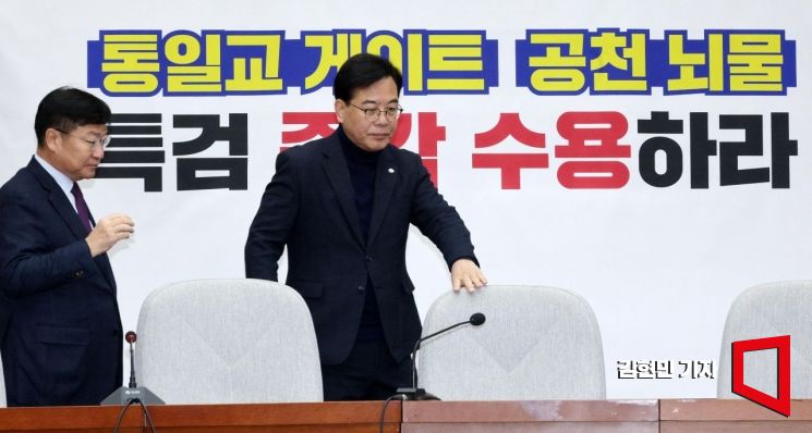 송언석 국민의힘 원내대표가 27일 국회에서 열린 원내대책회의에 참석하고 있다.