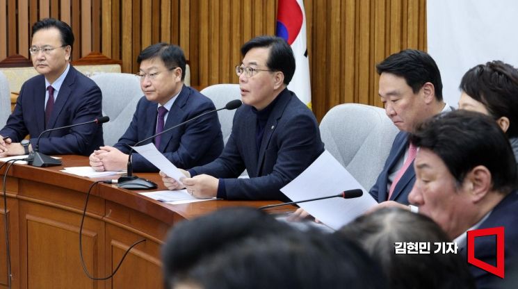 송언석 국민의힘 원내대표가 27일 국회에서 열린 원내대책회의에서 발언하고 있다.