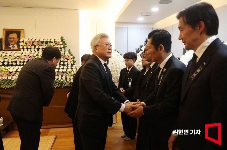 문재인 전 대통령이 27일 오후 서울 종로구 서울대학교병원 장례식장에 마련된 고 이해찬 민주평화통일자문회의 수석부의장의 빈소를 찾아 조문하며 정청래 더불어민주당 대표와 인사를 나누고 있다. 2026.1.27 사진공동취재단