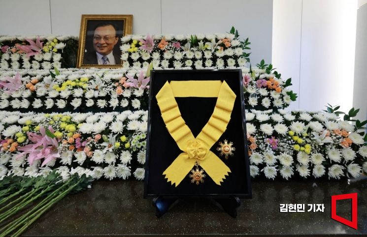 27일 서울 종로구 서울대병원 장례식장에 마련된 고 이해찬 전 국무총리 빈소에 이재명 대통령이 추서한 국민훈장 무궁화장이 세워져 있다.