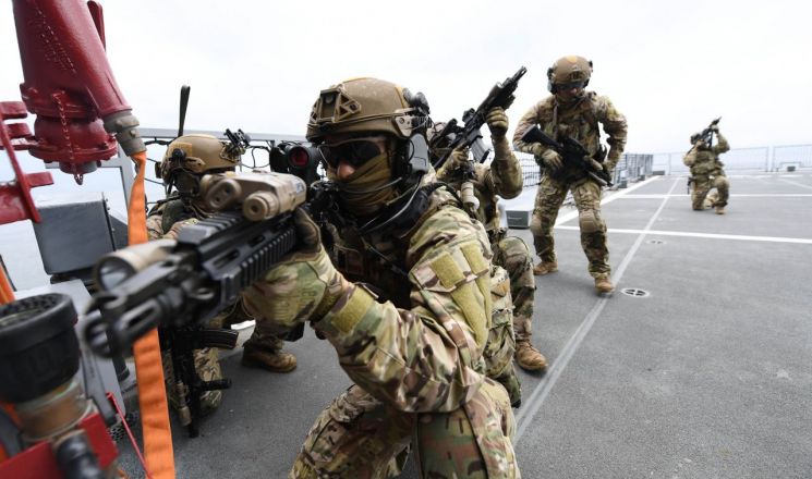 청해부대 30진의 해적대응 민관군 합동훈련에서 해군 특수전 대원(UDT/SEAL)으로 구성된 검문검색대 공격팀이 피랍 상선으로 가정한 함정 내부를 수색하고 있다. (사진제공=해군) 연합뉴스