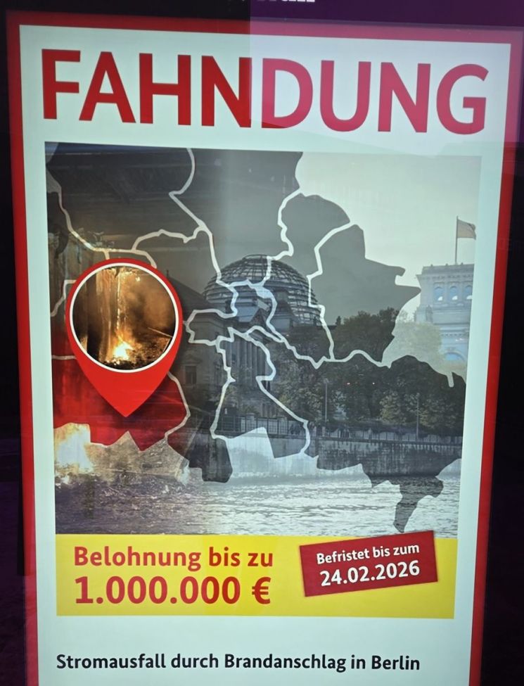 27일 연합뉴스는 일간 타게스슈피겔 등을 인용해 독일 연방 검찰이 전력망 방화 사건의 용의자에 관한 결정적인 제보를 제공할 경우 최대 100만유로(약 17억 2000만원)의 현상금을 지급하겠다며 현상금을 내걸었다고 보도했다. 당국은 관련 내용을 담은 안내 광고판을 베를린 시내 주요 지역에 설치했다.
