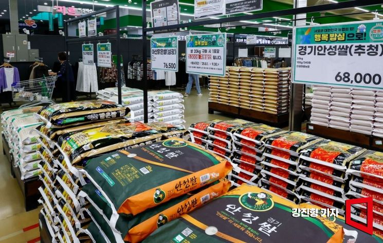 한국농수산식품유통공사 집계에 따르면 쌀 20kg 평균 소매가격은 6만294원으로 지난해보다 17.2% 상승한 가운데 5일 서울 서초구 하나로마트 양재점 판매대에 쌀이 진열돼 있다. 농식품부는 지난달 1일부터 대형 유통업계와 협력해 진행 중인 쌀 20kg당 3000원 할인 행사도 최근 쌀값 상승을 감안해 오는 11일부터 5000원으로 상향할 계획이라고 밝혔다. 2025.9.5 강진형 기자