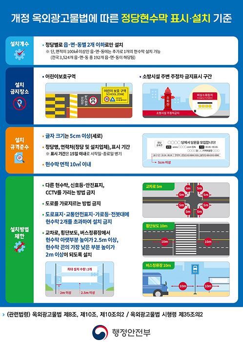 또한 오는 6월 3일 실시 예정인 전국동시지방선거와 관련해, 선거일 전 120일 이내에 정당 현수막을 게시할 경우 '공직선거법' 제90조에 따른 시설물 설치 제한 규정에 위반될 수 있어 각별한 주의가 요구된다고 시는 설명했다.