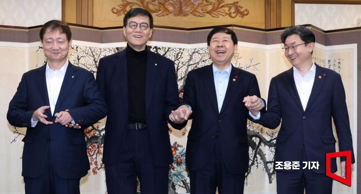 구윤철 부총리 겸 재정경제부 장관 등 경제수장들이 29일 서울 종로구 정부서울청사에서 열린 확대거시경제금융회의에서 참석해 기념 촬영을 하고 있다. 왼쪽부터 이찬진 금감원장, 이창용 한국은행 총재, 구 부총리, 이억원 금융위원장.