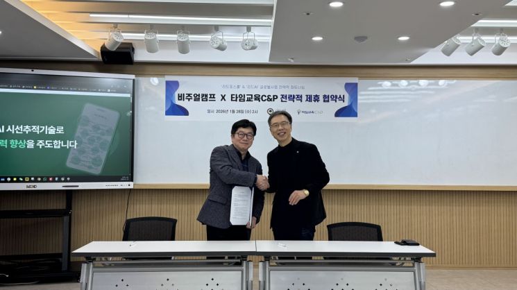 AI 기반 시선추적기술 기업 비주얼캠프가 에듀테크 전문기업 타임교육C&P과 전략적 제휴 협약을 맺었다고 29일 밝혔다. 문해력 진단·향상 프로그램 '리드포스쿨'과 '리드AI'를 글로벌 에듀테크 시장에 선보이기 위함이다.