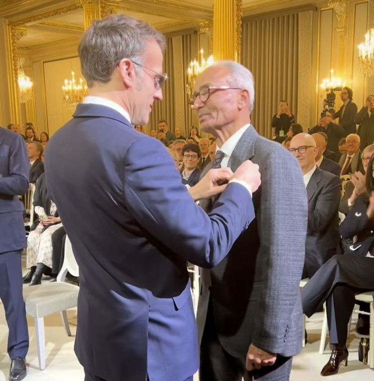 마크롱 "헌신적인 삶, 통합의 본보기"…훈장 받은 73세 '거리 신문 판매원'