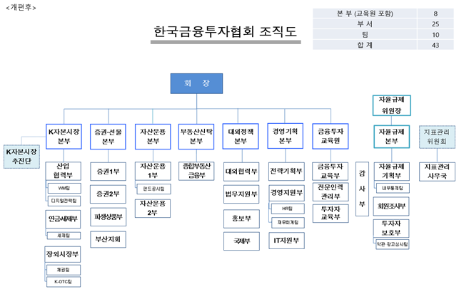 협회는 "이번 조직개편을 통해 자본시장의 장기 비전을 제시하는 한편, 회원사의 당면한 과제를 신속하게 해결하는 보다 전문화된 서비스를 제공해 나갈 계획"이라고 밝혔다.