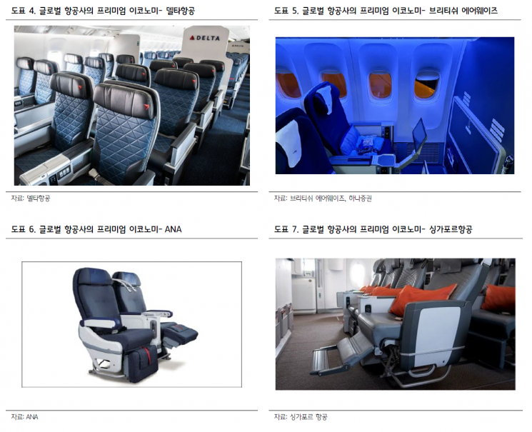 하나증권은 이같은 배경에서 국내 항공주의 성장 잠재력을 엿봤다. 지난해는 글로벌 대형항공사(FSC)에서 프리미엄 좌석의 수요가 부각되는 시기였다. 델타항공의 프리미엄 좌석 매출은 연간 7% 성장하면서 전체 매출을 견인했다. 유나이티드항공도 마찬가지였다. 지난해 전체 매출은 전년 동기 대비 4% 증가한 반면, 프리미엄 좌석 매출은 11% 성장했다. 이코노미 좌석 매출은 5% 증가에 그쳤다.